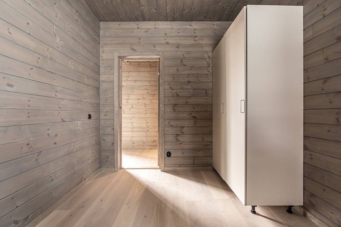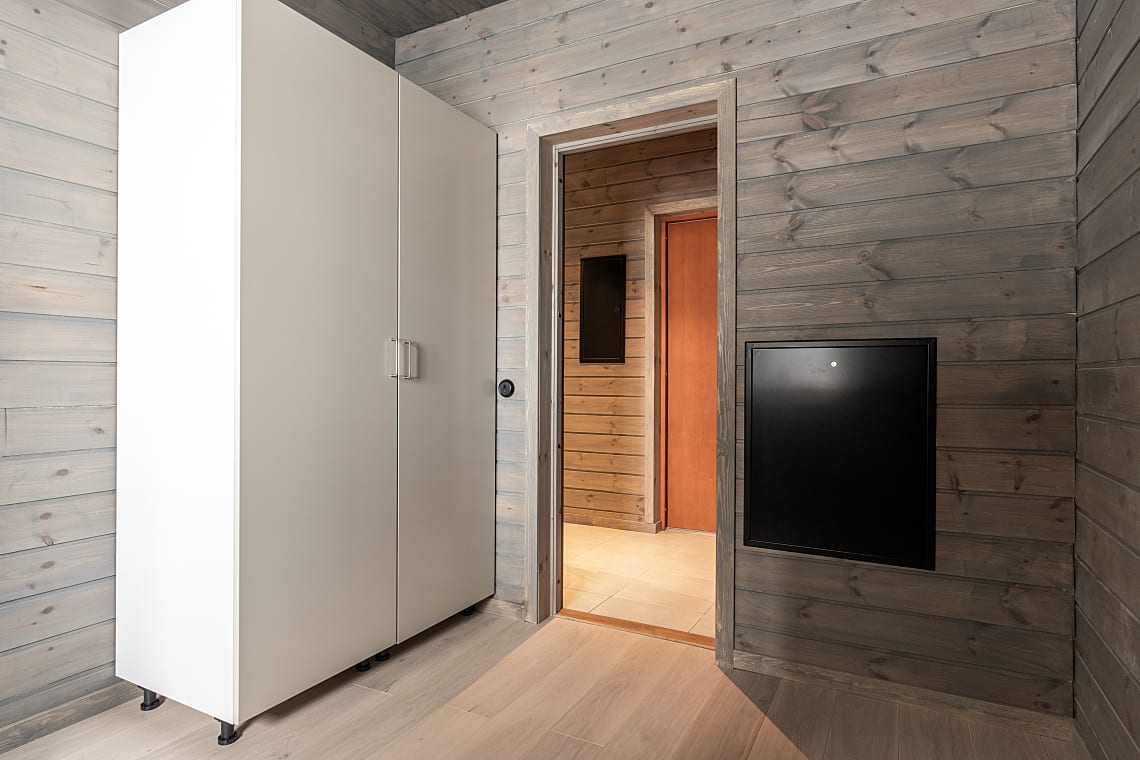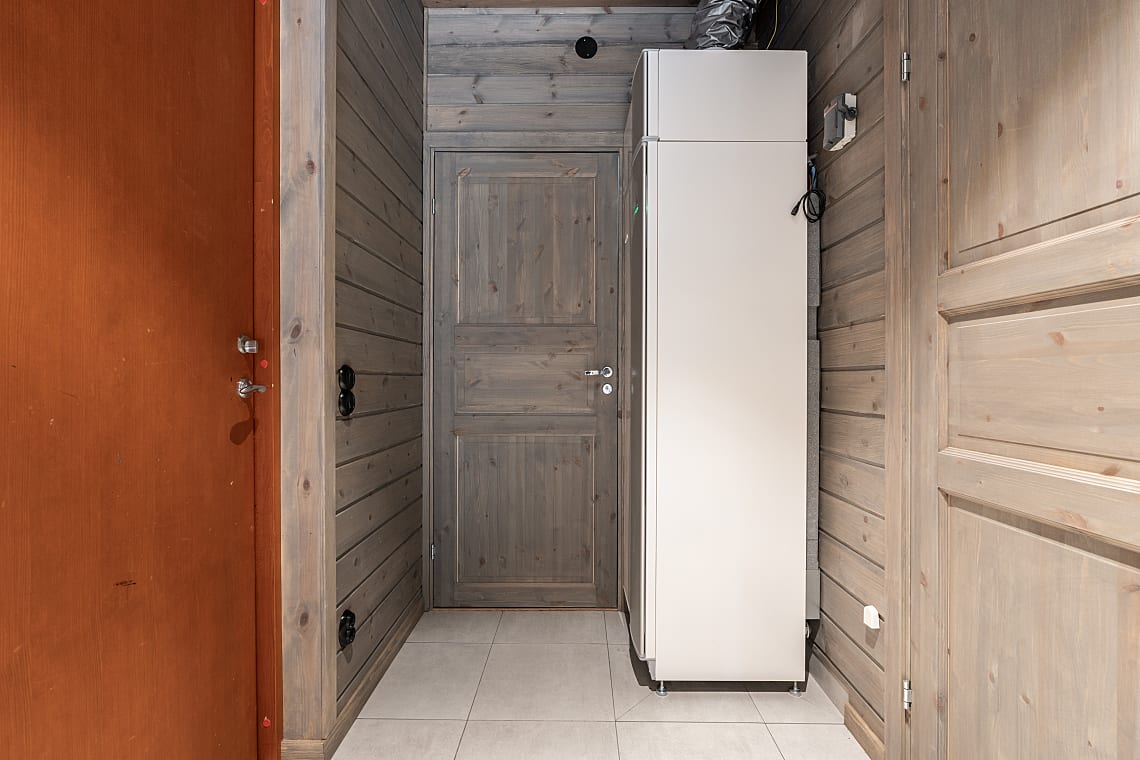 Välkomnande hall med plats för klädavhängning, garderober och torkskåp.