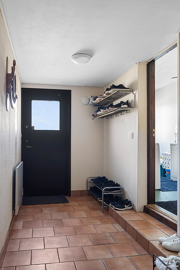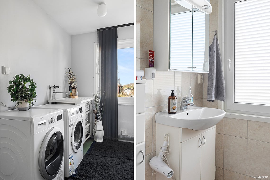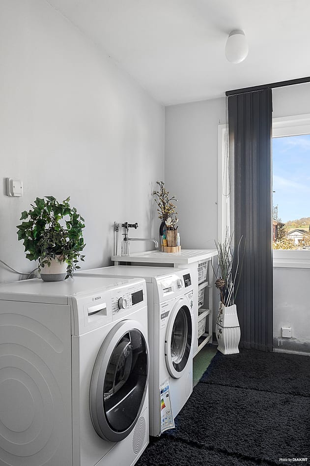 Tvättstugan är tilltagen i storlek och erbjuder både förvaringsmöjligheter och praktisk arbetsyta. Via groventrén tar du dig vidare till både förråd och garage, samt ut till trädgården – en smart och funktionell lösning för vardagens logistik.