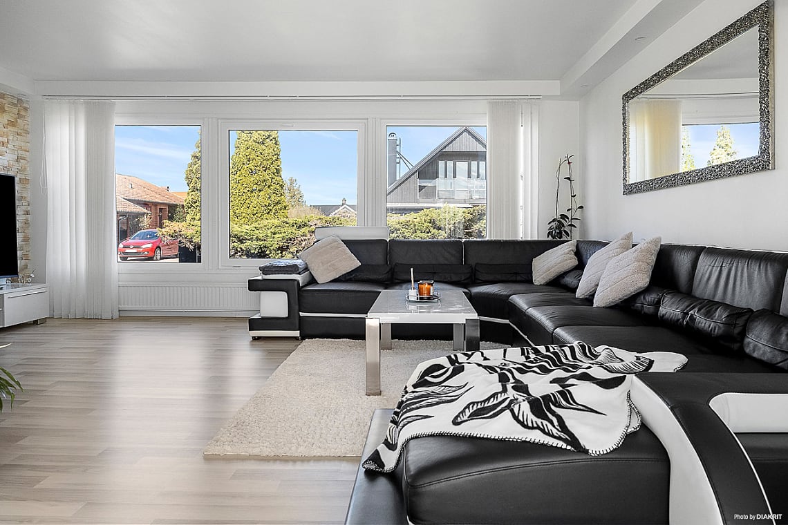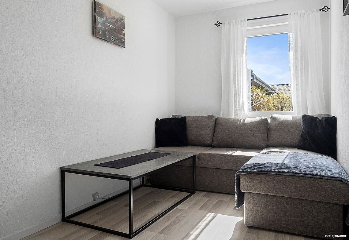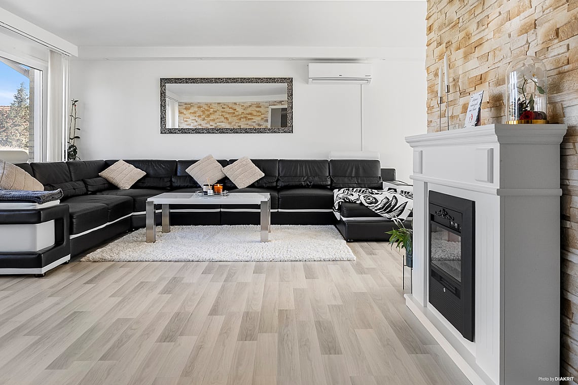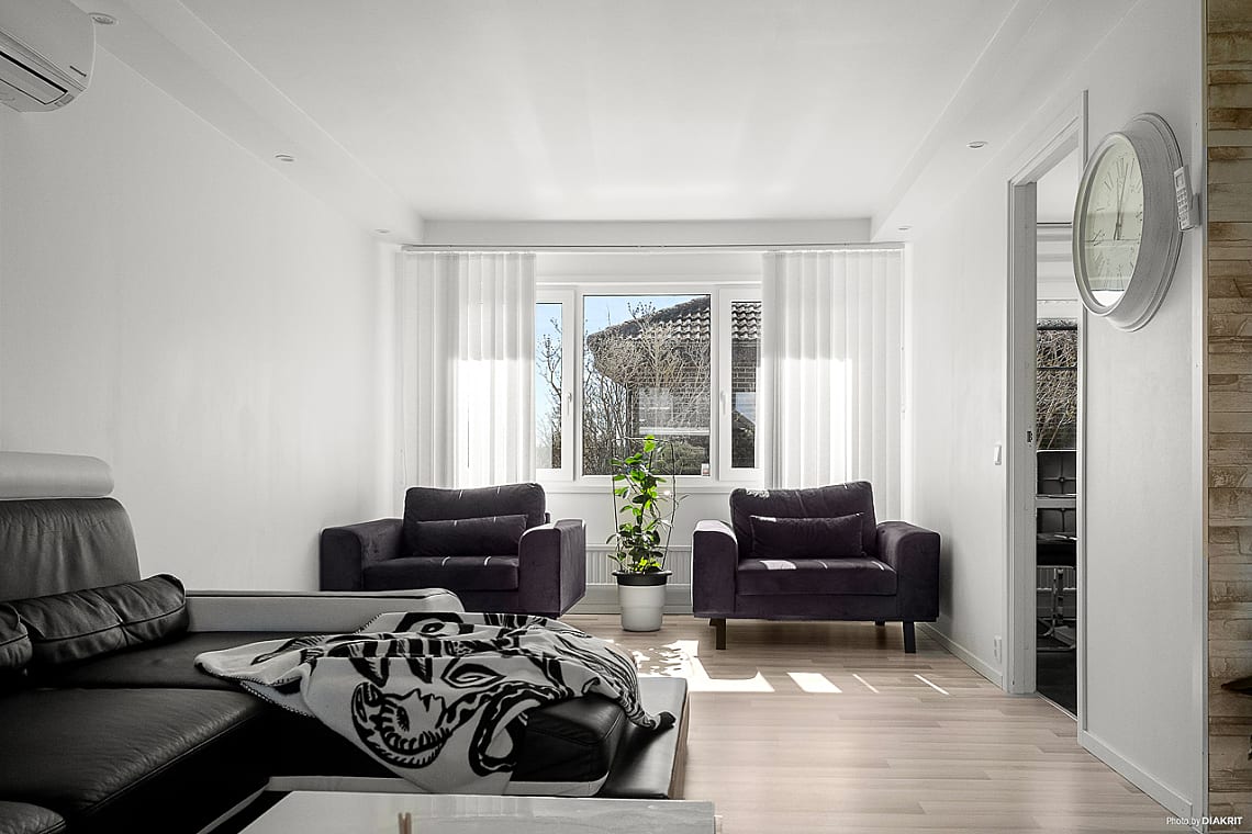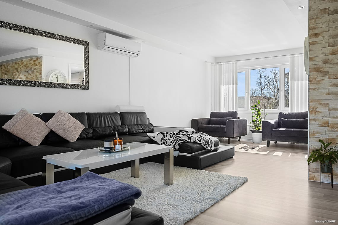Vidare in öppnar bostaden upp sig mot ett stort och luftigt vardagsrum – den perfekta platsen för såväl vardagsmys som stora sammankomster. Här finns utrymme för att samla släkt och vänner, eller bara njuta av en lugn kväll framför TV:n. Den sociala planlösningen binder samman vardagsrum och kök på ett naturligt sätt. Renoverat2021