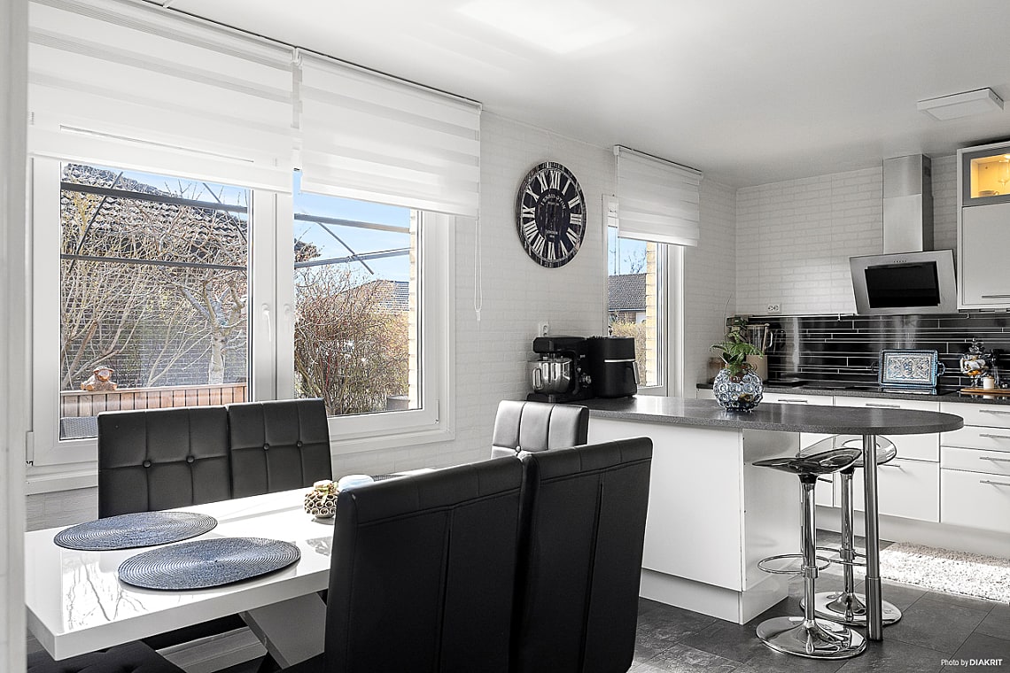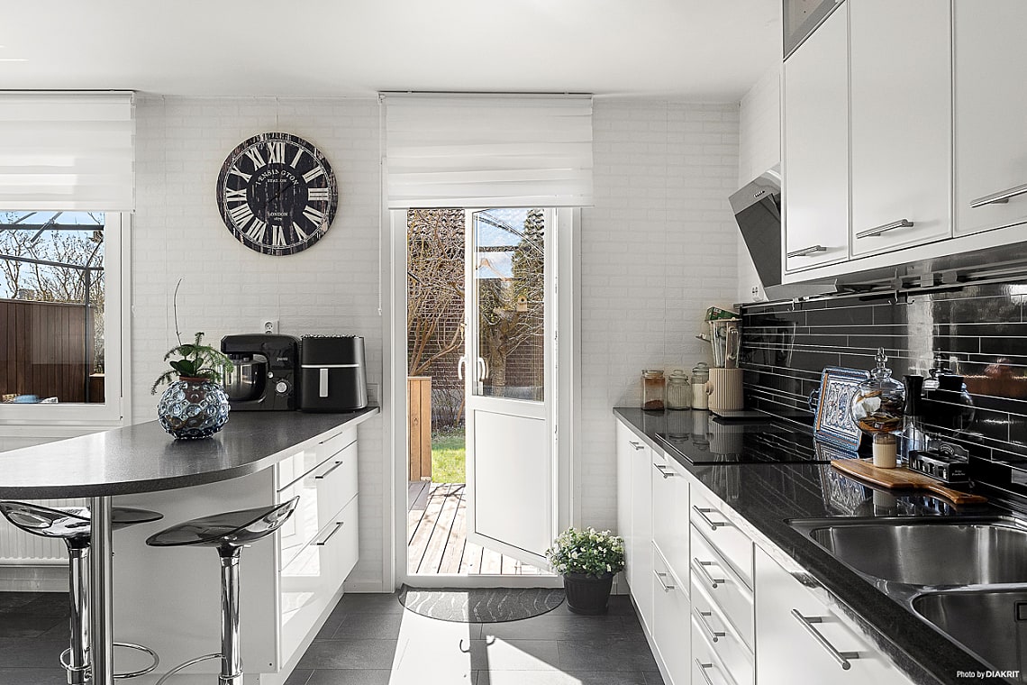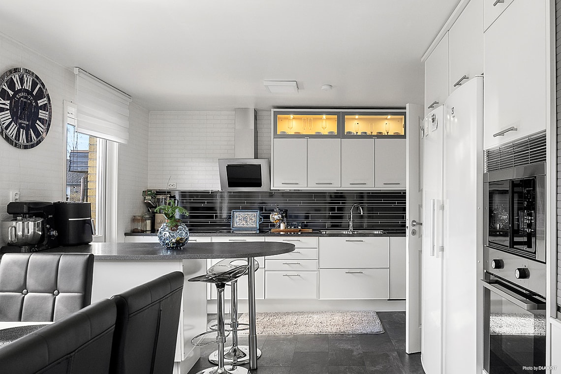 Köket är modernt och smakfullt inrett i vitt med matchande vitvaror, uppdaterade av nuvarande ägare. Här finns gott om arbetsytor för matlagning och ett naturligt utrymme för matbord. Renoverat 2021