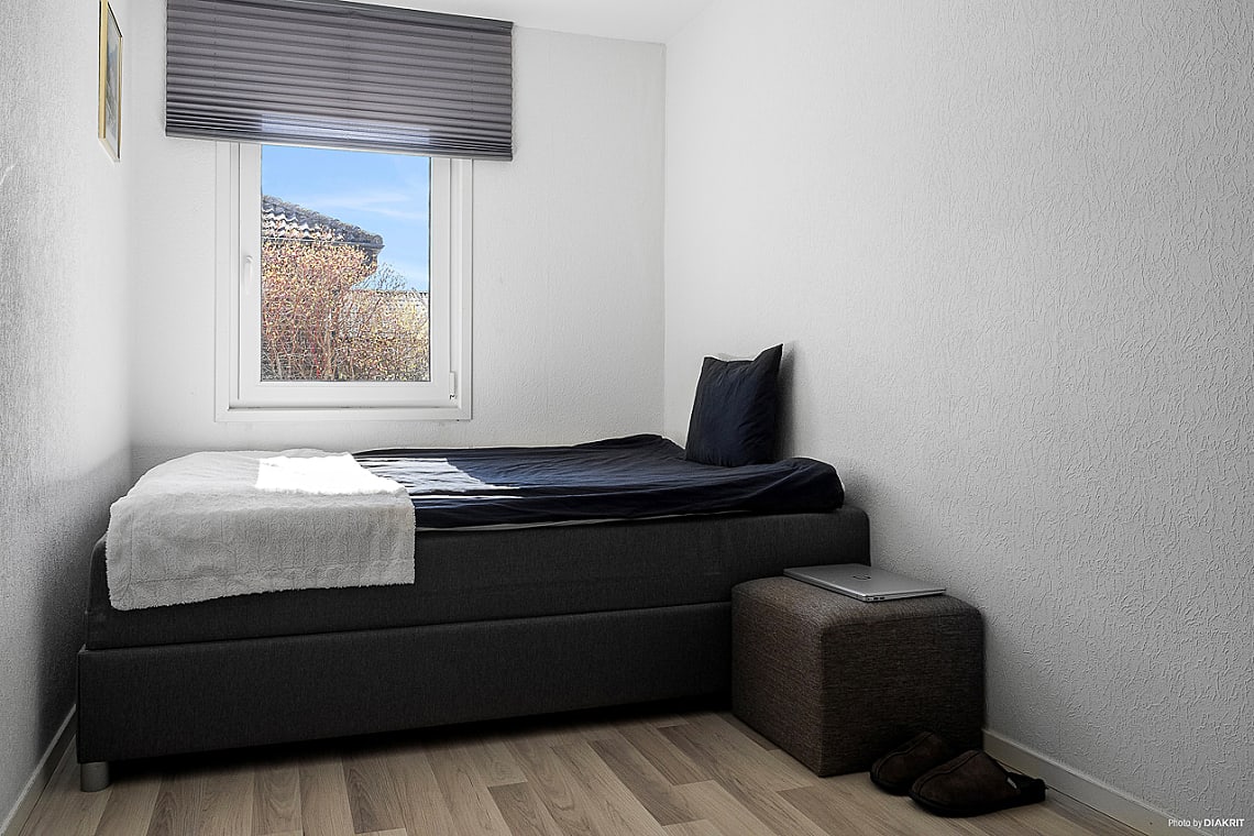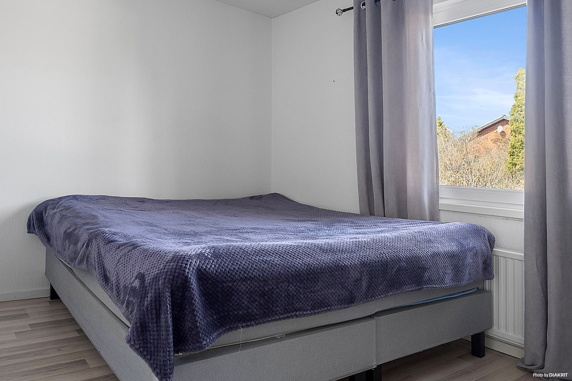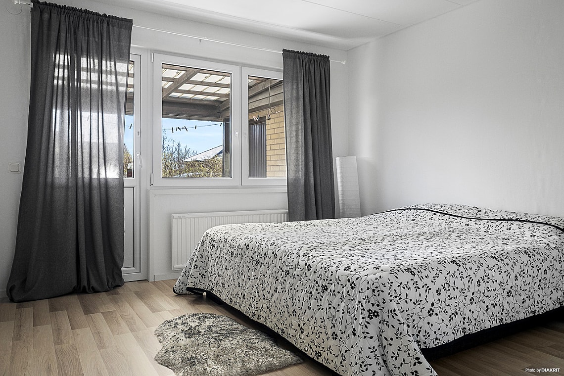 Från hallen nås villans fyra sovrum, varav två är större och rymmer dubbelsäng utan problem – perfekt för både barnfamiljen och för dig som önskar ett hemmakontor eller gästrum. Här finns också ett helkaklat badrum utrustat med dusch.