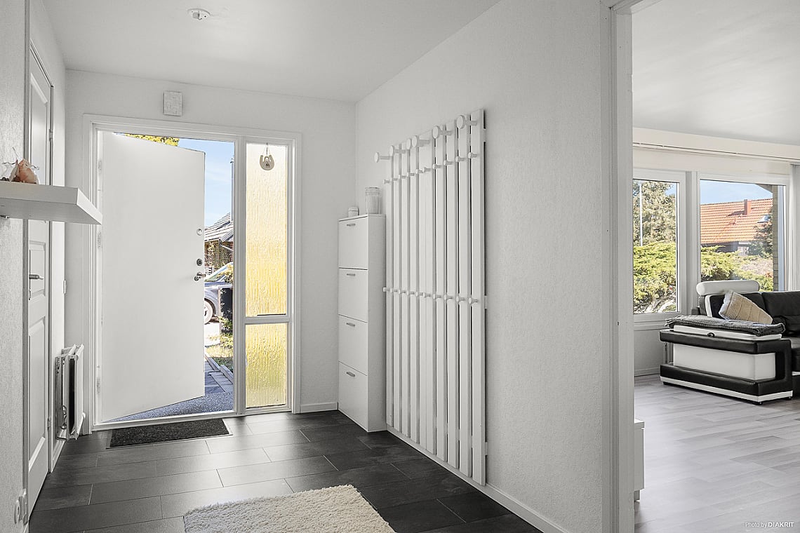 Redan i entrén möts du av ett stilrent gråsvart melerat laminatgolv som löper enhetligt genom hela huset – både praktiskt och snyggt. Den rymliga hallen erbjuder goda avhängningsmöjligheter och skapar en välkomnande känsla. Direkt till höger ligger gäst-WC, smidigt placerad för både vardag och fest.