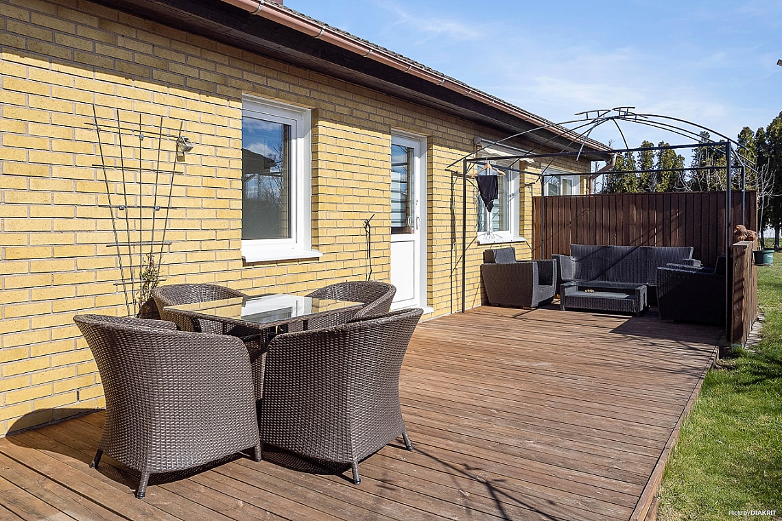 Trädäcket i anslutning till köket, blir snabbt en favoritplats för familjemiddagar, grillkvällar eller en kopp kaffe i morgonsolen.